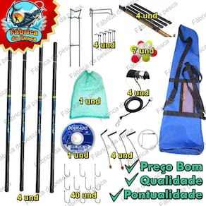 kIT DE VARAS TELESCÓPICAS COM DIVERSOS ITENSÓtimo para PESQUEIRO NA PESCA DE TILÁPIAS4 VARAS TELESCÓPICAS 2x 3,60 2 x 2.704 SUPORTES DE VARA (serve em qualquer vara de pesca)4 ENROLADORES DE LINHA PARA VARA TELESCÓPICA4 ANTENINHAS PARA PONTA DE VARA1 LINHA 100M MONOFILAMENTO 100 metros40 ANZOIS7 BOIAS1 SACOLA PARA ARMAZENAMENTO DOSPEIXES.4 SALVA VARAS1 BOLSA DE 70 CM FEITA EM NYLON 600 DE ÓTIMA QUALIDADE.VARAS COM EXCELENTE QUALIDADE.MELHOR CUSTO BENENFICO DO MERCADO !!!