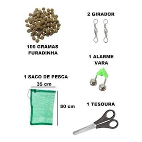 Kit pesca completo vara 1,70 mts + molinete com linha + itens Todos nossos produtos são conferidos antes de enviarmos, para assim evitar futuros problemas ao receber sua compra. Esse kit foi criado com itens básicos de necessidade para sua pescaria, iremos lhe enviar 84 itens. Descrição: 1 - vara telescópica cmik/taue/jws 1,70 metros - retrátil vermelho, azul , amarela e verde - cor enviada conforme estoque - tamanho: 1,70 metros - material: fibra de vidro tubular - resistencia - 12 a 20 lbs 1 molinete ht 200 cmik - 2 rolamentos vermelho, azul , amarela e prata- cor enviada conforme estoque - material do corpo: grafite - material do carretel: grafite - manivela: intercambiável direito ou esquerdo - knob: plástico - sistema anti - reverso - velocidade de recolhimento: 5.2:1 - capacidade de linha: 0,18mm 245m / 0,20mm 200m / 0,25mm 125m - peso: 140 gramas Resistencia maxima 5kg cada Cores aleatorias, será enviado a cor disponivel no estoque, mas enviaremos as cores que mais combinam. 02 - boia de isopor - tipo lambari - nº 4 - 1,8 cm x 2,7 cm - utilizada para controlar a profundidade da isca em pesqueiros, lagos e represa quando colocada no chicote entre o anzol e a boia. Possuí passagem central com bastão de plástico para travar. 02 - boia de isopor - tipo lambari - nº 5 - 2,1 cm x 3,1 cm - utilizada para controlar a profundidade da isca em pesqueiros, lagos e represa quando colocada no chicote entre o anzol e a boia. Possuí passagem central com bastão de plástico para travar. 02 - boia de isopor - tipo lambari - nº 6 - 2,8 cm x 3,9 cm - utilizada para controlar a profundidade da isca em pesqueiros, lagos e represa quando colocada no chicote entre o anzol e a boia. Possuí passagem central com bastão de plástico para travar. 10 - chumbadas tipo bolinha - 0,3 a 0,5 gramas cada aproximadamente 100 gramas de isca tipo furadinha - ideal para pesca de tilápia, pacu, piau, porquinho entre outros. 01 - sacola de peixe usada para guardar os peixes, feita em tela verde tipo mosquiteiro, com corda de nylon para amarrar - medida do saco de pesca - 35 cm x 50 cm 01 - tesoura tipo escolar ideal para corte de linha, iscas entre outros. 06 - anzol em aço carbono super resistente, niquelado/prateado, afiado a laser. Tamanho 3 - medindo 1 cm x 0,5 cm 06 - anzol em aço carbono super resistente, niquelado/prateado, afiado a laser. Tamanho 4 - medindo 1,1 cm x 0,6 cm 06 - anzol em aço carbono super resistente, niquelado/prateado, afiado a laser. Tamanho 5 - medindo 1,3 cm x 0,6 cm 06 - anzol em aço carbono super resistente, niquelado/prateado, afiado a laser. Tamanho 6 - medindo 1,4 cm x 0,6 cm 06 - anzol em aço carbono super resistente, niquelado/prateado, afiado a laser. Tamanho 7 - medindo 1,5 cm x 0,7 cm 06 - anzol em aço carbono super resistente, niquelado/prateado, afiado a laser. Tamanho 8 - medindo 1,7 cm x 0,8 cm 06 - anzol em aço carbono super resistente, niquelado/prateado, afiado a laser. Tamanho 9 - medindo 2 cm x 0,9 cm 06 - anzol em aço carbono super resistente, niquelado/prateado, afiado a laser. Tamanho 10 - medindo 2,1 cm x 0,9 cm 06 - anzol em aço carbono super resistente, niquelado/prateado, afiado a laser. Tamanho 11 - medindo 2,2 cm x 1 cm 06 - anzol em aço carbono super resistente, niquelado/prateado, afiado a laser. Tamanho 12 - medindo 2,4 cm x 1,1 cm 02 - girador nickel em aço nº 8 - 2 cm - ideal para não torcer a linha. 01 - sino de vara, ideal para colocar na ponta da vara em espera, pois ele emite um som quando o peixe está mexendo a isca, ajudando assim na fisgada.