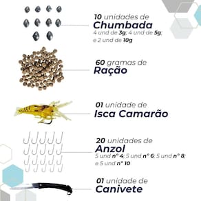 Kit pesca completo vara telescópica + molinete ul + iscas Cor: azul Kit acompanha: 1 linha já enrolada no carretel do molinete 1 vara telescóíca de 1,7 para molinete 1 molinete ultra light 5 unidades de anzol nº 4 5 unidades de anzol nº 6 5 unidades de anzol nº 8 5 unidades de anzol nº10 4 unidades de chumbada de 5g 2 unidades de chumbada de 10g 4 unidades de chumbada de 3g 9 unidades de boias lambari 1 unidade de snap com girador 1 unidade de 1 unidade de isca lambari 1 unidade de isca camarão 1 pacote de ração com 60g 1 maleta Especificações técnicas: Vara Fabricante: cmik Modelo: telescópica Material: fibra de vidro Utilização: molinete Tamanho: 1,70m Potência: leve Três passadores + ponteira Medida da vara recolhida e com o protetor de ponta 48 cm Peso: 105 gramas Disponível nas cores: verde / azul / vermelho / amarelo Molinete: Marca: cmik ou taue Material do corpo: grafite Material do carretel: grafite Manivela: intercambiável direito ou esquerdo Knob: plástico - sistema anti - reverso Velocidade de recolhimento: 5.2:1 Capacidade de linha: 0,18mm 245m / 0,20mm 200m / 0,25mm 125m Peso: 140 gramas Rolamentos 2