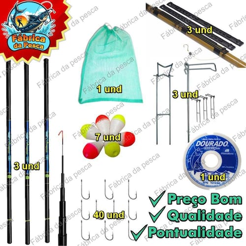 Kit pesca vara de mao telescopica de 2,70 mt.Super leve e resistenteMarca: Albatroz muito renomada no mercado...Conteudo:3 varas 2.70 mt mista carbono1 rolo de linha de 100 metros3 suporte vara com 3 posicao1 pacote boia lambari c/ 7 unidades40 anzois 4 tamanhos diferentes 10 cada tamanho .1 sacola para armazenar os peixes capturados.Cortesia 3 enrolador de linha super util para guardar sua vara e deixar a mesma com a linha e o anzol sem perigo de machucar !!!!!Produto em estoque pronto para envio !!! postamos em menos de 24 horas .