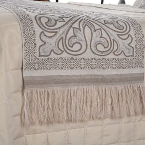 Um toque moderno para complementar a sua decoração. A peseira Grécia, com detalhes geométricos, alegres e cheios de cor, é o investimento ideal para quem deseja um quarto harmonioso. Sua padronagem foi criada no tecido jacquard, resistente, de alta durabilidade e alto padrão de qualidade com acabamento rústico e contemporâneo. A peça oferece conforto na medida certa. Para completar, o artigo conta ainda com franjas, detalhe que é uma super tendência. Acompanha duas almofadas cheias e todos os itens poderão ser usados dos dois lados.