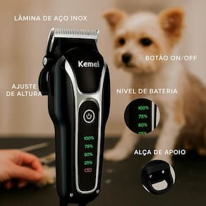 Kit Pet Kemei Ideal Para Dog Maquininha Tosadora Cachorros s/ Fio Máquina Tosa de Pet Kemei 1991 Bivolt Os animais também se incomodam com pelos e unhas grandes, e com a Kemei 1991 você corta e apara unhas e pelos sem grandes problemas. Seja para uso em casa ou em ambiente , a Kemei 1991 oferece alta performance, permitindo manter seu Pet sempre limpo e confortável. Possui uma tela LCD digital que ajuda a verificar o estado da bateria durante o carregamento ou operação, mantendo você sempre informado. O aparelho opera com baixo ruído, o que contribui para não assustar ou causar medo no animal, proporcionando uma tosa segura. Características Técnicas Sem Fio Tensão: Bivolt Potência: 5W Lâminas de aço inoxidável Lâmina ajustável para comprimento de corte de 0,5 mm para 1,0 mm Nível de acabamento ajustável Motor de alta velocidade Rotação rápida Operação estável Sem aquecimento Tempo de carregamento: Aproximadamente 3 horas Autonomia da bateria: Até 120 minutos de uso contínuo 4 pentes guia: 3mm / 6mm / 10mm / 13mm Tensão Entrada V : 5V Corrente mA : 1000mA Itens Inclusos - 1 Máquina Km-1991 - 1 Fonte BiVolt - 4 Pentes Guia - 3,6, 10 e 13mm - 1 Bisnaga com Silicone - 1 Pente - 1 Cortador de unhas - 1 Lixa - 1 Manual do usuário Dúvidas Frequentes - A máquina é adequada para Pets de médio e grande porte Sim, é eficaz em animais de qualquer tamanho devido ao ajuste de altura e aos 4 pentes guia. - O produto é resistente É feito com materiais de alta qualidade e durabilidade. Marca: Não Informado Ean: 7905232098302