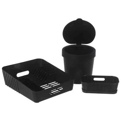Detalhes: 1 Escorredor de louças 27 cm x 11 cm x 34 cm 1 Lixeira de 3,5 litros 20 cm x 20 cm x 19 cm 1 Organizador de pia 9,5 cm x 6 cm x 20 cm