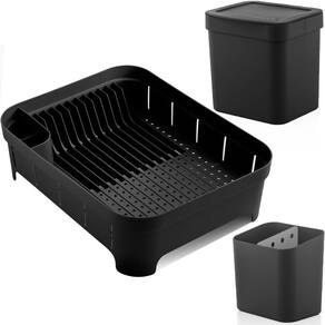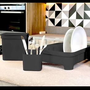 O kit é essencial na composição da cozinha e se adaptará a qualquer decoração. Sendo ideal para você que busca aliar a praticidade no dia a dia com sua pia organizada. Os organizadores de louças, permitem separar e organizar os talheres, pratos, copos e outros utensílios em cima da bancada e possuem base vazada para o escoamento da água. Já a lixeira por ser compacta proporciona praticidade e não ocupa tanto espaço na bancada.
