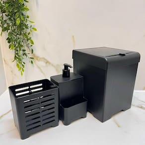 Kit Pia Stolf 3 Peças Smile Com Caixa REF. 1554-P - Preto O Kit Pia Smile 3 Peças com Caixa, deixará sua cozinha com a personalidade que ela merece. Nosso kit vai adicionar um toque de estilo e funcionalidade ao seu ambiente, mantendo-o sempre organizado. Composto por 3 peças incríveis, ele vai dar o charme que faltava para o seu cômodo. Fabricado com materiais de alta qualidade, o kit é resistente e durável, garantindo seu uso por muito tempo. Características:ean: 7897996720578Marca: StolfModelo: REF. 1554-pcor: PretaO kit contém:1 Dispenser para detergente e esponja De 650ml1 Porta talheres1 Lixeira De 5.4 LDimensões da Embalagem: Altura: 23cmLargura: 19cmProfundidade: 19cmPeso: 0,765 KgGarantia: 12 Meses