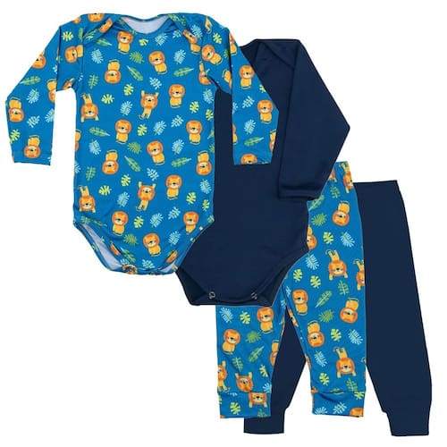 O Kit pijama térmico Bebê com 2 Bodies e 2 Calças Leõezinhos Marinho é confeccionado em malha Energy Up Thermo Dry com tecnologia térmica que absorve melhor o suor, deixa o bebê confortável, aquecido e com a temperatura mantida. É o kit de pijama ideal para o inverno. Os bodies possuem botões de pressão entre pernas.