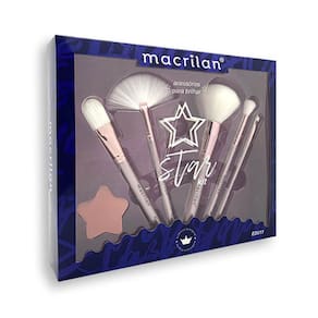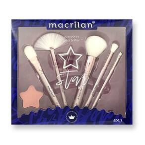 O kit pincel Macrilan Star Ed011 possui 05 pincéis de cerdas sintéticas, 1 presilha de cabelo e 1 esponja super macia, sem látex, em formato de estrela. Os pincéis possuem cerdas e formatos que permitem um acabamento suave e impecável, além do cabo moderno e de fácil manuseio.