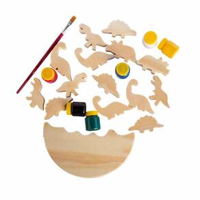 São 13 peças ( 12 dinossauros e 1 ovo grande) em madeira de reflorestamento, 6 cores de tinta atóxica e pincel para colorir