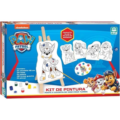 SUPER COMPLETO: O kit de pintura da Nig Brinquedos possui 4 telas com lindos desenhos, 1 cavalete de 45cm, 1 paleta de cores em madeira reflorestada, 6 tintas guache atóxicas coloridas e 1 pincel.