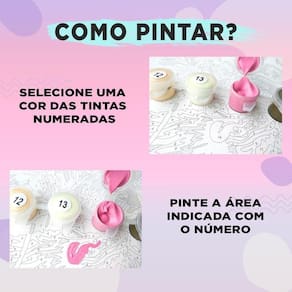 Instruções: Para pintar é muito fácil Adesive as suas tintas de acordo com o Guia para as tintas; Desenrole a tela em um local plano; Molhe os pincéis na água; Abra o potinho de tinta; Molhe o pincel com um pouco de tinta; Pinte a área indicada com a numeração do potinho de tinta; Preencha a tela com todas cores;