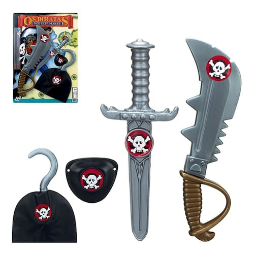 Kit Pirata Dos Sete Mares Com Espada E Acessórios contem: espada 1 tampa olho 1 mão de guancho 1 facão diversão garantida com o Kit Pirata Dos Sete Mares Com Espada E Acessórios. não fusiona na pilha registrado no inmetro 2443/2017BRI28 Marca: Kit pirata Ean: 7896464702993