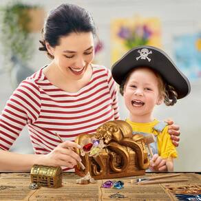 - Dive como um verdadeiro aventureiro: para bagunçar um pouco esses kits, sugiro que você coloque algumas toalhas de papel na mesa primeiro, adicione um pouco de água no bloco de argila e escave-o com os cinzéis e o martelo, varra a poeira com o pincel. Em seguida, enxágue as relíquias com água limpa, um tesouro fresco e único que você receberá! Então aprenda e explore com o mapa, como um verdadeiro pirata! E colete todo o tesouro que você encontrou no mini baú do tesouro que está incluído
