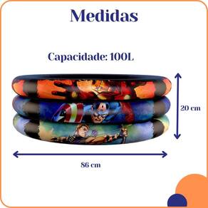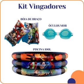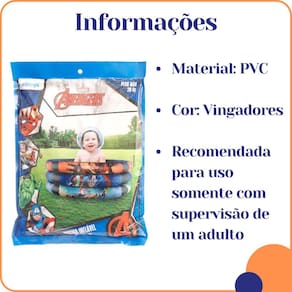 PISCINA AVENGERS 100LFácil montar e manter, a piscina inflável da Etitoys é a melhor opção para se refrescar com a família e amigos. Pegue o traje de banho, os chinelos e o protetor solar, e prepare-se para passar momentos inesquecíveis ao sol.Para os mais pequenos!Sua capacidade de 100 litros a torna em um lugar de diversão adequado para meninos e meninas de até 2 anos de idade, onde eles poderão jogar e aproveitar de horas na água.Aviso legal• Idade mínima recomendada: 3 anos.BOIA INFLÁVEL PARA BRAÇO AVENGERS 23X14CMPara que as crianças se divirtam na piscina com mais segurança e claro, com seus personagens preferidos!Material plástico de 23x14 centímetros com estampa personalizada, sendo duas câmeras de ar separadas, facilitando o uso.Recomendadas para uso somente com supervisão de um adulto. Não é um equipamento salva-vidas. Então tome sempre cuidado.- Dimensões da Peça: 23 x 14cm- Material: PVC- Cor: Colorido (Estampa Avengers)- Tipo de Embalagem: Saco plástico c/ Paper Card- Marca: Etitoys- Origem: China Atenção: Este produto não é um equipamento salva-vidas.Cuidados: Usar somente em água com supervisão de um adultoÓculos- Dimensões: 14,5 x 4,5 (CxL)Lentes em poliestireno, proteção ocular e do nariz em PVC macio, tiras reguláveis em borracha, regulagem entre as lentes em PVC.