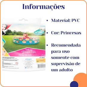 PISCINA PRINCESAS DISNEY 70 LITROSFácil montar e manter, a piscina inflável da Etitoys é a melhor opção para se refrescar com a família e amigos. Pegue o traje de banho, os chinelos e o protetor solar, e prepare-se para passar momentos inesquecíveis ao sol.Para os mais pequenos!Sua capacidade de 70 litros a torna em um lugar de diversão adequado para meninos e meninas de até 2 anos de idade, onde eles poderão jogar e aproveitar de horas na água.Aviso legalIdade mínima recomendada: 3 anos.COLETE INFLÁVEL PRINCESAS 43X35CMCom a Bóia Colete das Princesas da Etitoys, aproveitar os dias de calor na piscina com segurança se tornou muito mais simples e divertido.Com as princesas, as meninas estarão livres para usar a imaginação nas horas de brincadeira, com a liberdade e segurança que a bóia colete oferece.- Dimensões da Peça: 35 x 10 x 43cm- Quantidade Master: 36 Peças- Material: 100% PVC- Cor: Rosa com Estampa Princesas- Marca: Etitoys- Origem: China- Contém: 1 unidadeCaracterísticas:- Peso máximo suportado: 30kg- Dimensões aproximadas do produto inflado: 43x35cm- Pode regular até 35x40cmCuidados:- Este produto deve ser montado por um adulto.- Este produto não é um equipamento salva-vidas.- Crianças devem utilizar este produto sob a supervisão de um adulto.- Guarde estas instruções para futuras consultas.Óculos- Dimensões: 14,5 x 4,5 (CxL)Lentes em poliestireno, proteção ocular e do nariz em PVC macio, tiras reguláveis em borracha, regulagem entre as lentes em PVC. Ean: 7899739202198