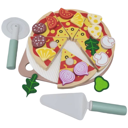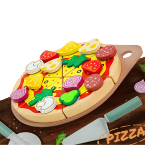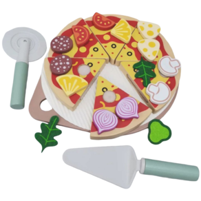 Conteúdo do kit (25 peças): 1 Mini pizza cortável em 6 fatias 1 Mini tábua 1 Mini espátula 1 Mini cortador 16 Ingredientes variados