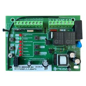 Descrição Técnica Placa: - Freio eletrônico com 5 níveis - Fonte automática 90 ~ 240 VCA - Memória interna: 90 botões - Sistema de recepção HCS anti-clonagem - Frequência de recepção: 433 Mhz - Saída 12 VCC - Fim de curso sensor Hall - Parada suave (habilitada de fábrica) - Apaga controle individual - Grava controle Master - Entrada para foto célula - Saída fechadura (FCH)