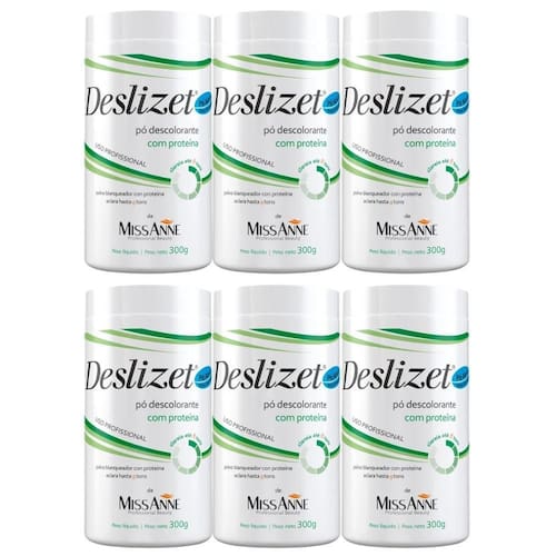 Pó Descolorante Deslizet Proteína 300g O Pó Descolorante Deslizet Miss Anne proporciona um procedimento de descoloração rápido e eficaz, descolore facilmente os cabelos sem danificá-los. Os cabelos durante o processo químico de descoloração podem torna-se ressecados e danificados. A Miss Anne pesquisou e desenvolveu o Deslizet Pó Descolorante com proteínas que oferecem excelentes resultados nos processos de clareamentos total, mechas, balayagens, reflexos e luzes. AÇÃO/ATIVOS: O Pó Descolorante Deslizet Miss Anne foi cuidadosamente desenvolvido para promover um processo rápido e eficaz de descoloração dos cabelos, promove um resultado excelente sem danificar os fios, protege e auxilia na hidratação dos cabelos. MODO DE USAR: Mais Informações estão contidas no verso da embalagem. . Marca: Não Informado
