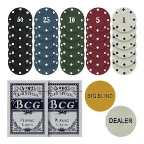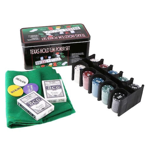 Kit poker profissional em lata 200 fichas texas hold'em set reúna os amigos sua família e passe horas se divertindo com esse maravilhoso jogo de poker de 200peças, ele possui uma linda lata decorada para transporte.Este conjunto é indispensável para quem gosta de jogos.Em uma lata decorada este conjunto contém 200 fichas para poker ou outros jogos.Divirta-se em casa com este incrível kit poker. Poker é um jogo de cartas jogado por duas ou mais pessoas muito comum em cassinos.É o mais popular de uma classe de jogos nos quais os jogadores com as cartas total ou parcialmente escondidas fazem apostas para um monte central, após o que o resultante das apostas é atribuído ao jogador ou jogadores que possuir o melhor conjunto de cartas dentre os que permaneceram na mão, ou ao jogador restante caso os outros tenham desistido. Lata decorada para transporte e armazenamento40x fichas brancas (valor 1)40x fichas vermelhas (valor 5)40x fichas verdes (valor 10)40x fichas azuis (valor 25)40x fichas pretas (valor 50)2 baralhos1 botão dealer1 botão small blind button1 botão big blind button1 tapete de jogo em feltro 87x58cm1 suporte de fichas1 instrução de uso.Obs: nao vendemos fichas separadamenteCaracterísticas:Material das fichas: polietilenoMaterial das cartas: papel cartaoDimensões da embalagem: 25cm x 20cm x 10cmDimensões das fichas: 38mm x 2mmPeso de cada ficha: 4,5gPeso total: 1,600kg Marca: Texas Hold'Em Set
