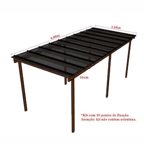 O kit não possui estrutura. Antes do uso as chapas devem ser armazenadas sobre uma superfície plana e protegidas de luz solar direta, chuva e ventoCurvatura a frio somente no sentido dos alvéolos Recomenda-se não furar a chapa devido ao grande coeficiente de dilatação do policarbonatoO filme de proteção indicando o lado do UV deve ficar para cima e precisa ser removido imediatamente após a instalação