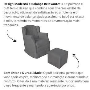 A poltrona de amamentação confortável foi projetada para oferecer conforto, com balanço suave e o puff garantem apoio total para os pés, reduzindo tensões e proporcionando relaxamento.