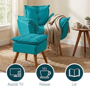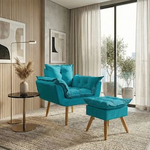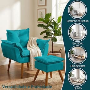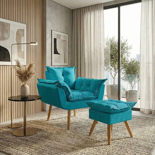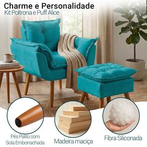 Kit Poltrona e Puff Alice Decorativa Confortável Para Sala Recepção Manicure Quarto Consultório Tecido Suede - Azul Turquesa
