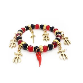 Linda pulseira feminina com pedras vermelhas e pretas e tridentes dourados.