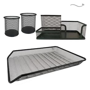 Kit organizadores de escritório preto composto por: - 01 bandeja organizadora simples preto - 01 organizador de mesa com 3 partições preto - 02 porta caneta preto