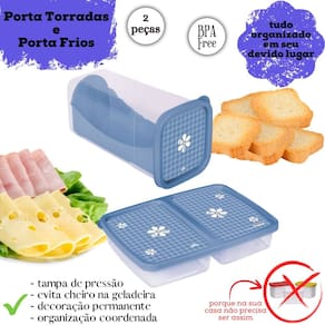 Ideal para acondicionar presunto e queijo, o porta frios tem o formato retangular e possui 2 divisórias com espaço suficiente para média porções (até 500g de cada). Perfeito para guardar biscoitos e torradas, o porta torradas tem suporte interno removível que facilita o uso do dia a dia.