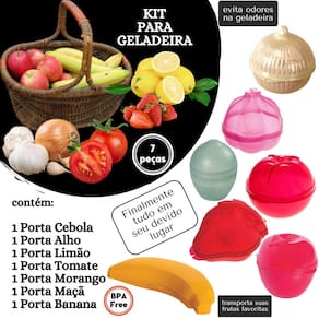 Kit de potes para guardar / armazenar alimentos na geladeira ou armário. É composto por 1 porta banana (C:22,0 x L:11,5 x A:5,1 cm), 1 porta morango (C:11,8 x L:14,0 x A:8,0 cm), 1 porta maça (C:11,2 x L:10,5 x A:10,5 cm), 1 porta limão (C:8,3 x L:8,3 x A:10,5 cm), 1 porta alho (C:11,4 x L:11,0 x A:9,7 cm), 1 porta cebola (C:10,5 x L:11,5 x A:10,6 cm) e 1 porta tomate (C:11,3 x L:10,4 x A:8,8 cm). Todos os potes são fabricados em polipropileno e não contém Bisfenol A (BPA Free). Podem ser levados ao freezer e ao micro-ondas.