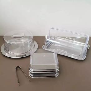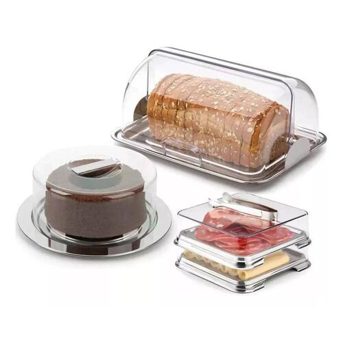 Kit Porta Pão, Porta Frios e Boleira Inox Tampa Pinça Forma Kit Porta Pão, Porta Frios e Porta Bolo em Aço Inox com Tampas Transparentes, modelo Vision, do fabricante Forma Inox.