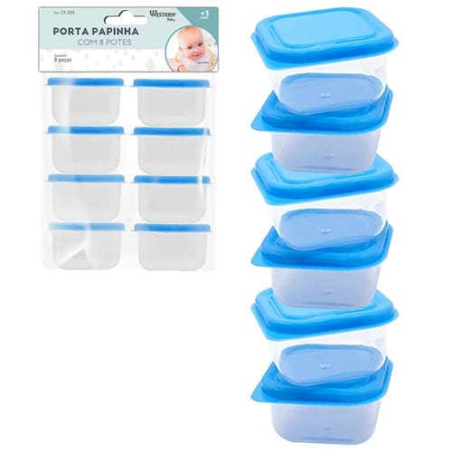 Informações do Produto: Com o kit porta papinha azul com 8 peças as mamães e os papais poderão armazenar as papinhas, lanches e frutas do bebê com mais praticidade. Eles são ideais para armazenar e congelar os alimentos mantendo o frescor e as suas propriedades nutritivas. Os potes podem ser utilizados na máquina de lavar e no micro-ondas.