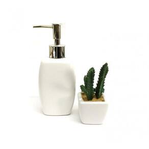 Este kit exclusivo para banheiro contempla 01 Porta Sabonete Líquido em porcelana branca com dosador em plástico e acabamento cromado, e ainda um mini vaso em cerâmica branca com uma planta suculenta artificial - Jolitex Ternille.