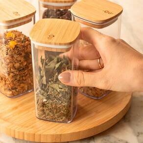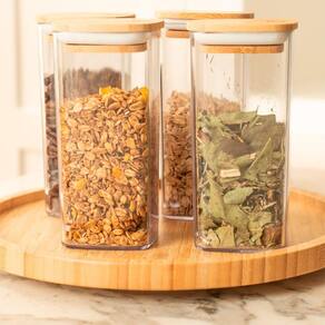Sustentabilidade e Design Premium: Feitos em bambu 100% renovável e poliestireno resistente, os produtos do kit oferecem sofisticação e durabilidade. Sistema Giratório de 360: O organizador permite fácil acesso aos itens, trazendo mais agilidade para a rotina. Vedação Hermética nos Potes: Proporciona conservação ideal para alimentos, mantendo-os frescos por mais tempo. Cuidados: Lave com esponja macia e sabão neutro; evite submergir em água e o uso no freezer, micro-ondas ou lava-louças. Após a lavagem, seque imediatamente. Guarde em local seco para evitar mofo. Caso necessário, use vinagre branco para limpeza.