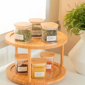 01 - Organizador Giratório Keep Bambu 25 x 25 x 2,5 cm : Sistema giratório de 360 para organizar e facilitar o acesso aos itens, perfeito para quem busca uma rotina mais prática e organizada.