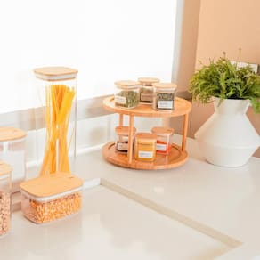 Sustentabilidade e Design Premium: Feitos em bambu 100% renovável e poliestireno resistente, os produtos do kit oferecem sofisticação e durabilidade. Sistema Giratório de 360: O organizador permite fácil acesso aos itens, trazendo mais agilidade para a rotina. Vedação Hermética nos Potes: Proporciona conservação ideal para alimentos, mantendo-os frescos por mais tempo. Cuidados: Lave com esponja macia e sabão neutro; evite submergir em água e o uso no freezer, micro-ondas ou lava-louças. Após a lavagem, seque imediatamente. Guarde em local seco para evitar mofo. Caso necessário, use vinagre branco para limpeza.