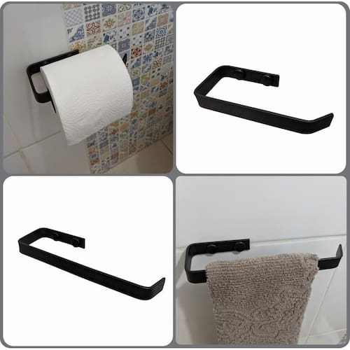 Kit porta toalha de rosto e porta papel higiênico supremo Kit 2 peças para banheiro supremo Está querendo dar um toque á mais no seu banheiro O kit 2 peças supremo trás organização. Seu banheiro terá elegância e design, te proporcionando comodidade de ter seus itens bem proximo ao alcance de suas maõs. Este kit tem um excelente custo benefício, qualidade e durabilidade, é a escolha ideal para quem quer deixar seu banheiro com elegância e sofisticação. Fixação da peça: A fixação das peças é bem simples, basta parafusar os dois parafusos + buchas entre os buracos de fixação da peça e colocar o acabamento no produto. Esse tipo de fixação proporciona uma instalação onde a peça não fique frouxa no local instalado, deixando ainda mais atraente a sua funcionalidade da peça Ficha técnica: Material: aço / barra chata 1/8 x 5/8 - 3,2mm Pintura: eletrostática epoxi. Cor: preto fosco. Conteúdo da embalagem. 1 porta toalha de rosto 1 porta papel higiênico Ótima escolha para atender suas diferentes necessidades. de 3 meses do fabricante. Marca: Não Informado Ean: 7890284477529