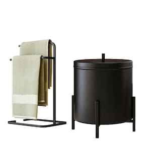 O Kit Toalheiro e Cesto De Lixo De Banheiro e Cozinha Level possuí um design moderno e sofisticado, ambos contam com uma base de aço maciço, e uma pintura eletrostatica com resistencia a umidade no acabamento preto fosco. A Lixeira De Banheiro tem um cesto em aluminio que se encaixa na base evitando o contato com o chão, já o porta toalha evita que as toalhas fiquem amarrotadas e úmidas por serem colocadas em um lugar inadequado. Composto por peças práticas que dispensam o uso de ferramentas para instalar evitando transtorno, furos nas paredes e sujeiras, ideal para banheiro, cozinha, lavanderia, salão de beleza, barbearia, clínica de estética entre outros. Peças que vêm trazer um diferencial para os seus ambientes mantendo-os limpo e organizados.