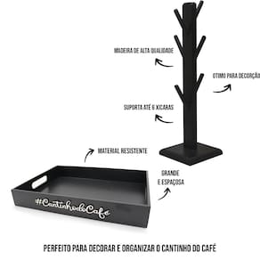 Kit porta xicaras bandeja cantinho do café suporte 6 pinos bandeja versátil e multiuso: feita em mdf de 6mm com pintura em tinta acrílica na cor preta ela é ideal para organizar o seu lar, servir um cafezinho para os amigos, organizar papeis de escritório entre diversas outras utilidades. Bandeja versátil, barata e de qualidade, combinando com todos os ambientes no qual estiver