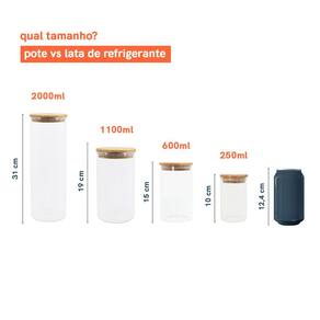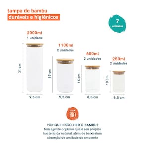 Esse KIT é composto por 7 peças: 1 Unidade – POTE 2L DE VIDRO COM TAMPA DE BAMBU CIRCULAR - OIKOS Altura: 31 cm Diâmetro: 9,5 2 Unidades - POTE DE MANTIMENTOS DE 1100ML COM TAMPA DE BAMBU – OIKOS Altura: 19 cm Diâmetro: 9,5 cm 2 Unidades - POTE 600ML DE VIDRO COM TAMPA DE BAMBU CIRCULAR – OIKOS Altura: 15 cm Diâmetro: 8,5 cm 2 Unidades - POTE 250ML DE VIDRO COM TAMPA DE BAMBU CIRCULAR – OIKOS Altura: 10 cm Diâmetro: 6,5 cm