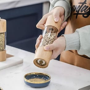 - Design clássico com lâminas de metal, ajuste para moagem fina ou grossa. Prático e rápido, ideal para moer pimenta ou sal, permitindo que você tempere diretamente no prato.