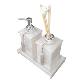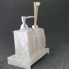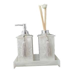 Kit Potes Em Acrílico Para Banheiro 3 Pçs Luxo K15PE1 Este Kit contém: 1 Bandeja Acrílica Pequena Retangularmulti uso tamanho 20cm x 11cm x 3cm. 1 Difusor de Ambiente com Pingente Decorativo e frasco para 200ml de essência do seu gosto (não acompanha). Medidas do difusor - 7 cm x 7cm x 14 cm. 1 Saboneteira Liquida em Acrílico com Válvula ABS Cromada e Pingente Decorativo. Possui frasco interno fácil de higienizar em pet com capacidade para 200ml de sabonete líquido. Medidas – 7cm x 7cm x 18cm (altura) Mais detalhes sobre o produto: Bandeja: Excelente produto multiuso para seus acessórios. Também serve como porta objetos, porta difusores de vidro, maquiagens, porta copos, organizador de gavetas e outros... O acrílico é um produto resistente, atóxico e fácil de lavar. Basta água corrente e sabão neutro. Não muda de cor com o passar do tempo. Difusor: Você pode adquirir as essências aqui em nossa loja também. (amadeirado, alecrim ou romã com lichia – todos 200mL) . Acompanha conjunto de varetas (4 varetas + 1 vareta decorativa) Maravilhoso conjunto 3 peças na cor pérola. Tudo o que o seu banheiro precisa com muita classe, estilo e praticidade. O acrílico é um produto resistente, atóxico e fácil de lavar. Basta água corrente e sabão neutro. Não muda de cor com o passar do tempo. Que tal uma bancada organizada, com cada coisa em seu devido lugar? Tudo com muita praticidade e muito estilo ? Conheça a nossa linha de acessórios para banheiros. Tudo confeccionado com acrílico cast de primeira qualidade. Altamente durável. Nosso material é atóxico, não possui cheiro e não muda de cor com o passar do tempo. Garantia: 3 meses
