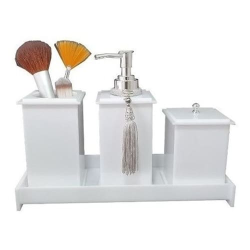 Este Kit contém: 1 bandeja acrílica média retangular multi uso tamanho 27cm x 11cm x 3cm (altura) 1 saboneteira liquida em acrílico com abs válvula cromada. Medidas – 7cm x 7cm x 18cm (altura) 1 Pote multi-uso com tampa. Medidas 7cm x 7cm x 11cm (altura) 1 Pote aberto multi-uso. Medidas 7cm x 7cm x 13 cm (altura) conjunto 4 peças na cor Branco. Não muda de cor com o passar do tempo.