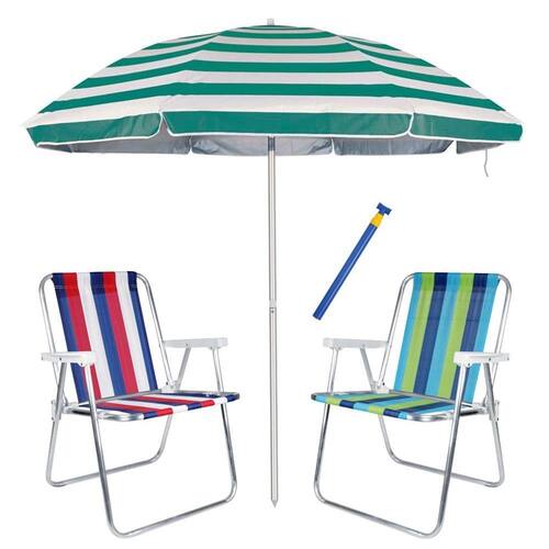 Kit Praia 2 Cadeiras Alta Alumínio + Guarda Sol 2,6m Listrado Alum + Saca Areia - Mor - Azul Turquesa