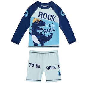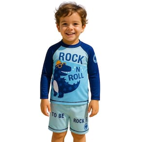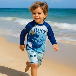Possui estampa divertida de dinossauro no estilo Rock'n Roll, ideal para proteger a pele das crianças durante dias ensolarados na praia ou piscina.