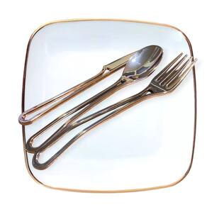 Design: Pratos quadrados com bordas rosê, oferecendo um toque moderno e sofisticado.