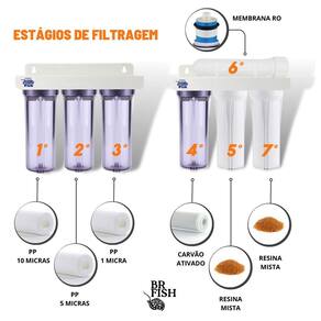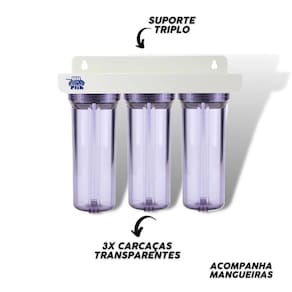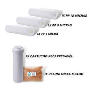 Kit com 3 carcaças transparentes, suporte triplo, conectores, 3 refis de polipropileno (10, 5 e 1 micra), cartucho recarregável e resina mista mb400 de 500g. Inclui mangueiras para instalação.Estágios de filtragem