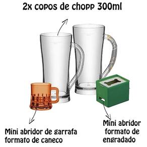 É composto de 2 canecos de chopp em poliestireno e 2 abridores de garrafas. Tudo isso em uma bela caixa, modelo exclusivo Boccati.