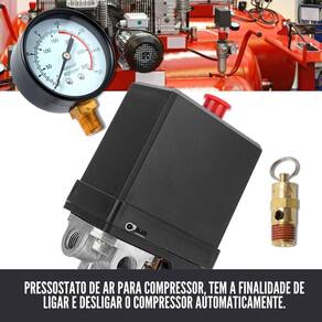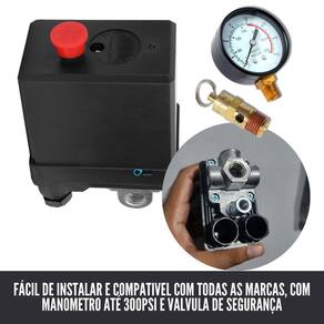 Pressostato Automático 80-120 PSI: Controla automaticamente o liga e desliga do compressor, mantendo a pressão ideal. 4 Vias com Botão: Facilita a instalação e o controle manual do sistema. Manômetro de Alta Precisão: Monitora a pressão do ar com exatidão, evitando sobrecargas. Válvula de Alívio: Proporciona segurança extra, liberando a pressão excessiva automaticamente.