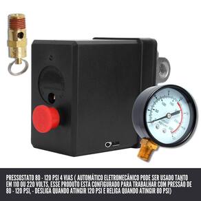 kit Pressostato Automático 80-120 4 Vias com Botão + Manômetro e Válvula de Alívio