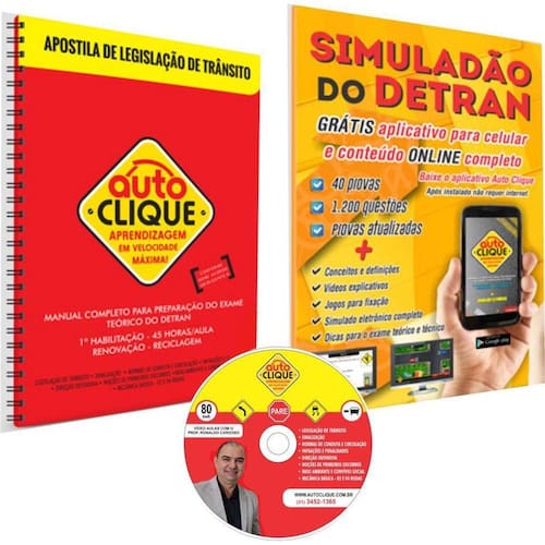 Kit aprovação na prova de legislação de trânsito - material completo para o aluno Preparatório para prova de primeira habilitação, do detran. Você que está passando pelo processo de habilitação, renovação ou recilagem para condutor infrator e quer passar na prova do detran de primeira. Adquirindo nossa apostila do aluno + apostila de provas do detran você ganha uma chave de acesso que dá direito a fazer o curso de legislação de trânsito online por 90 dias. - 1 manual (162 páginas) com todo o conteúdo do curso teórico de habilitação (45 horas / aula) - 1 manual com 40 provas simuladas e exercícios de fixação separados por matéria - 1 dvd com videoaulas do curso teórico - 1 chave de acesso para o App de estudos da Auto Clique. Módulos abordados nos materiais 1. Processo de habilitação; habilitação; veículos; 2. Infrações e crimes de trânsito e suas punições 3. Sinalização de trânsito 4. Normas de circulação e conduta 5. Direção defensiva 6. Primeiros socorros em acidentes de trânsito (noções) 7. Cidadania, convívio social e meio ambiente, no trânsito 8. Mecânica básica de veículos de 4 e 2 rodas (noções) - ESPECIFICAÇÕES DA APOSTILA DE PRIMEIRA HABILITAÇÃO PARA PROVA DO DETRAN Manual para primeira habilitação, completo, com excelente ilustrações que abordam todas as matérias exigidas pela legislação de trânsito e que caem na prova do detran de todos os estados. O manual é 100% atualizado O manual contém 162 páginas e aborda as seguintes disciplinas: Legislação de trânsito / infrações e penalidades / sinalização de trânsito / conduta e circulação / direção defensiva / primeiros socorros / meio ambiente e convívio social / noções de mecânica - 2 e 4 rodas. - ESPECIFICAÇÕES DO SIMULADO DE PROVAS DO DETRAN É um caderno de exercícios com 40 provas e 1.200 questões parecidas com as provas do detran. O simuladão de provas contém 92 páginas, sendo: 13 provas específicas por matéria; 27 provas completas incluindo todas as matérias; Dicas para o exame teórico-técnico; Dicionário de termos técnicos e siglas. -DVD CURSO TEÓRICO HABILITAÇÃO - VIDEOAULAS Próprio para o aluno se preparar para prova teórica do DETRAN - DVD Produzido em parceria com a Auto Clique e Professor Ronaldo Cardoso do Youtube. O DVD contém 26 videoaulas com muitas Dicas e Macetes - Completo e atualizado. São aproximadamente 5 horas/aula de video aulas + exercícios no final de cada módulo. - BÔNUS EXTRA: CHAVE DE ACESSO PARA O APP DE LEGISLAÇÃO DE TRÂNSITO DA AUTO CLIQUE Conteúdo didático: Legislação de trânsito / Infrações e penalidades / Sinalização de trânsito / Conduta e circulação / Direção defensiva / Primeiros socorros / Meio ambiente e convívio social / Noções de mecânica - 2 e 4 rodas. Jogos para fixação: Jogo da forca / jogo da memória / jogo da trivia / Jogo das placas / Quiz rally / Quiz de perguntas e respostas / Direção certa / simulador de carro em via. Vídeos: Diversos vídeos explicativos nas matérias. São vários vídeos para que você possa assimilar melhor as matérias. Simulado eletrônico: Teste os seus conhecimentos através do Simulado Eletrônico. Ele é idêntico ao do DETRAN e contém milhares de provas. São provas atualizadas de todos os estados. Em todas as provas, no final terá um gabarito para que você possa verificar o que acertou/errou. São 90 dias de acesso ilimitado ao App. Observações.: O material é 100% atualizado e revisado pelo professor e especialista em trânsito Ronaldo Cardoso. O curso não substitui a formação nas escolas, material de apoio apenas.